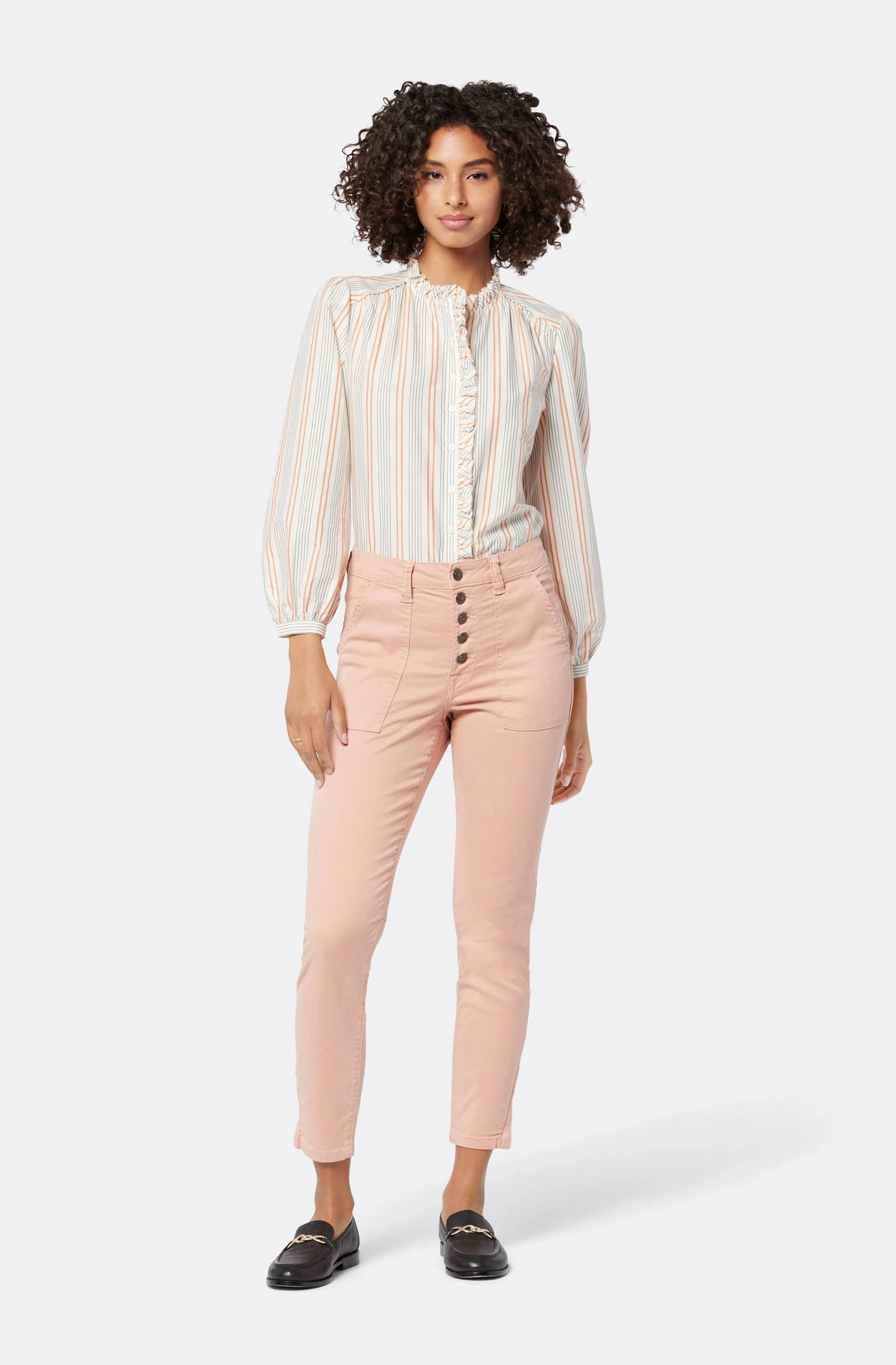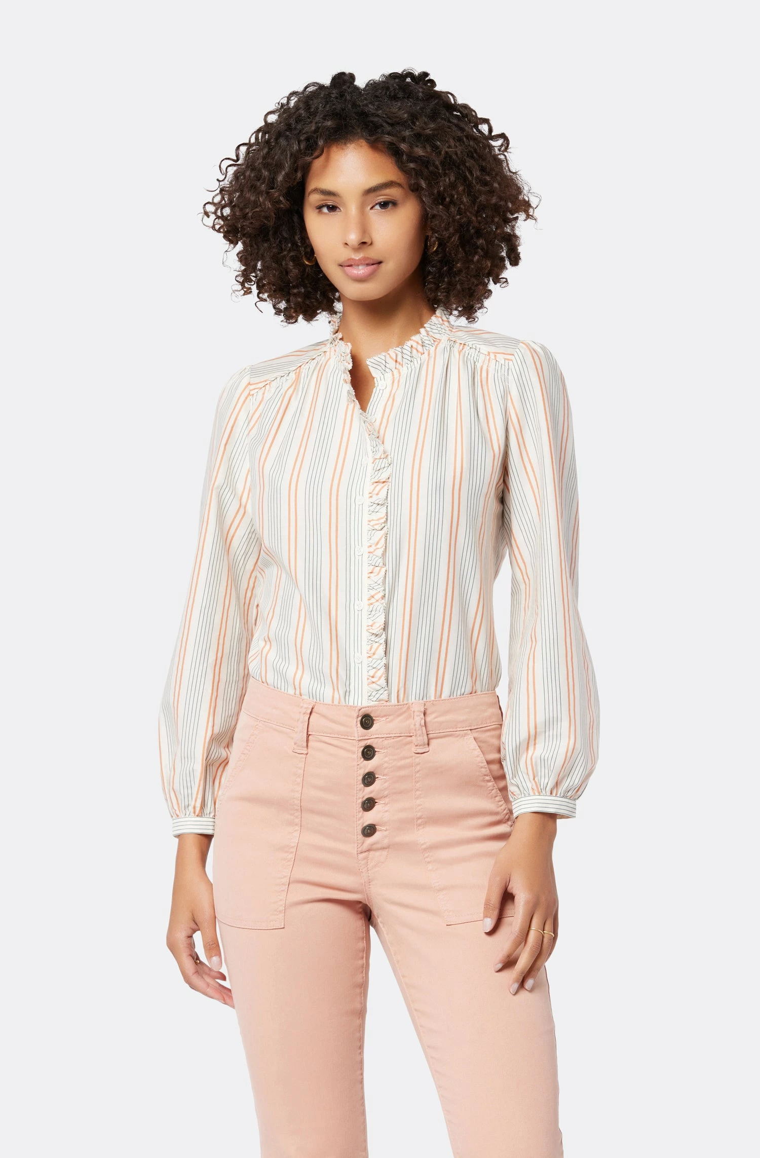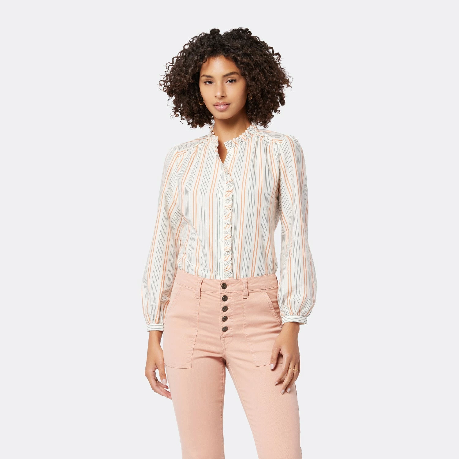 A romantic everyday shirt, The Alain stuns in a lightweight cotton/silk blend. This shirt features a small ruffled neckline, gentle gatherings, slightly-voluminous sleeves, and looks great with a pair of Joie jeans, or trousers for an elevated look.