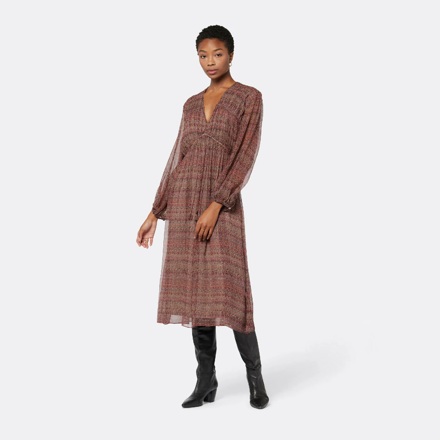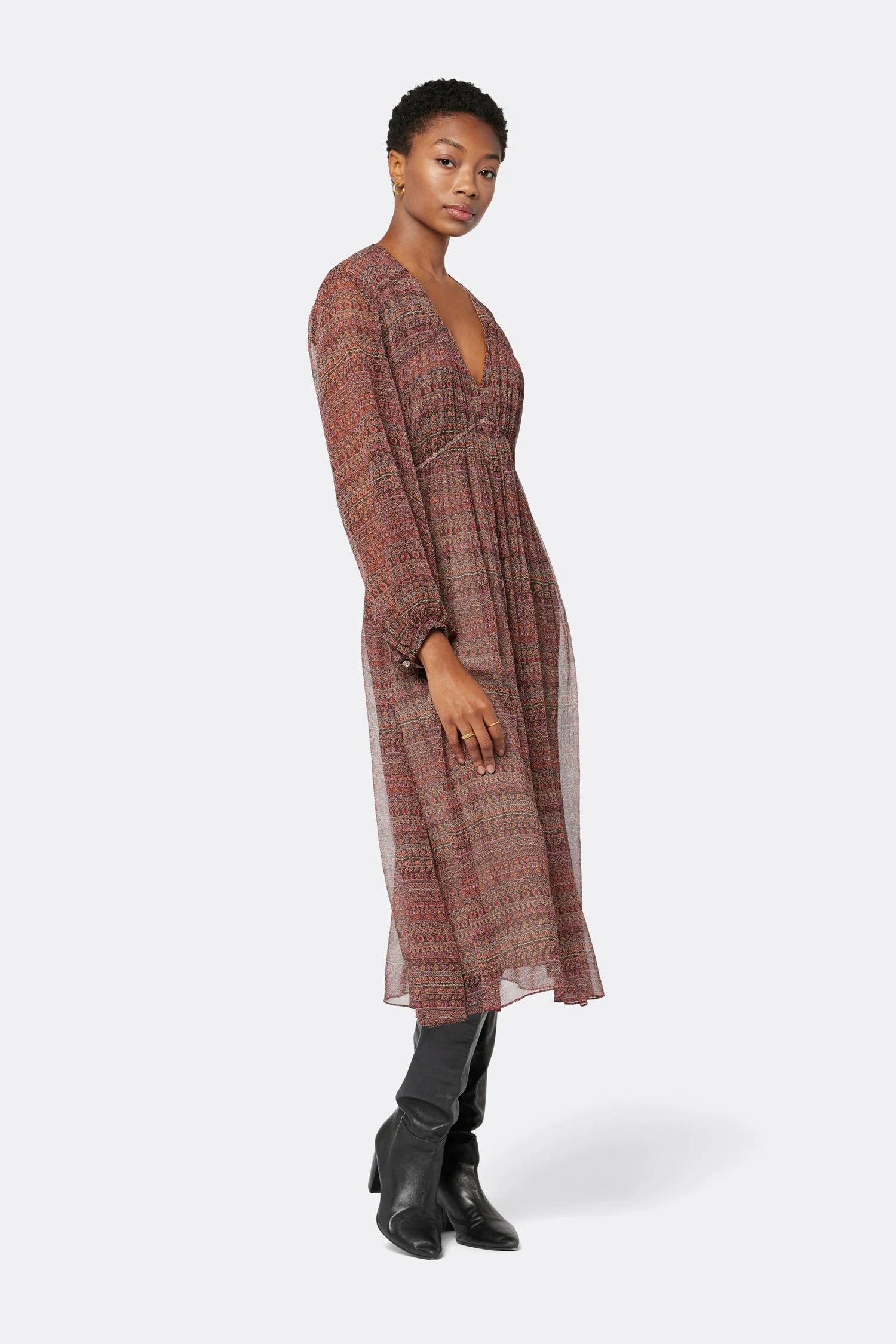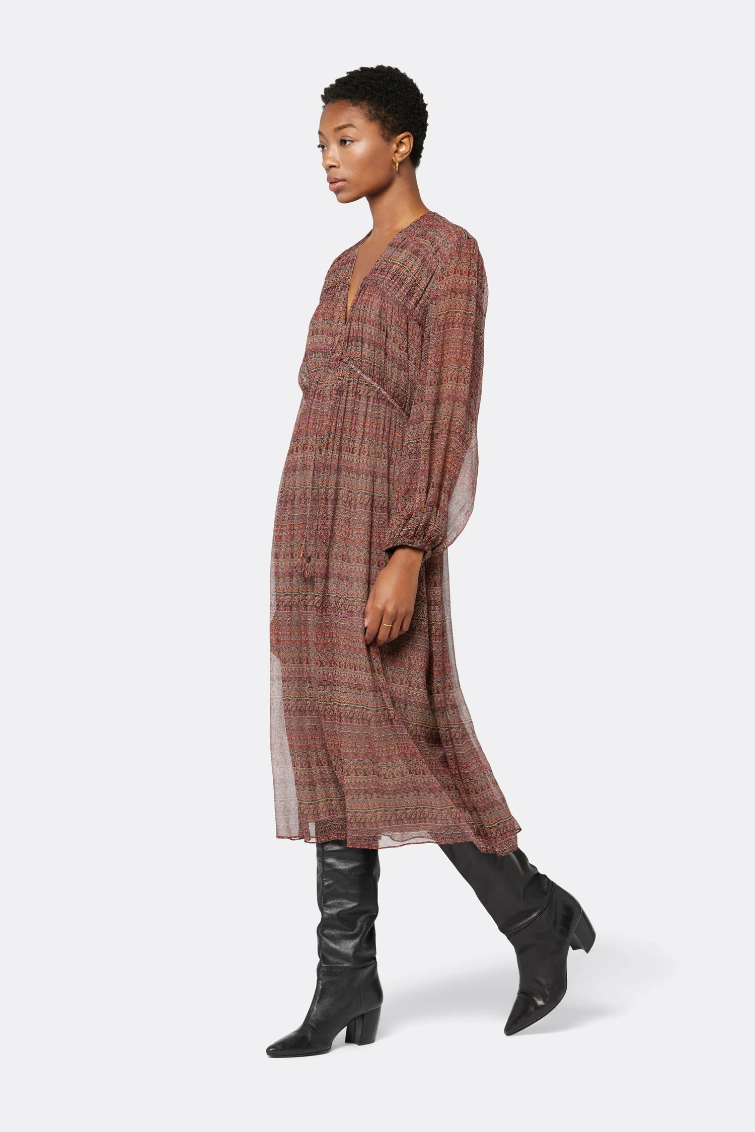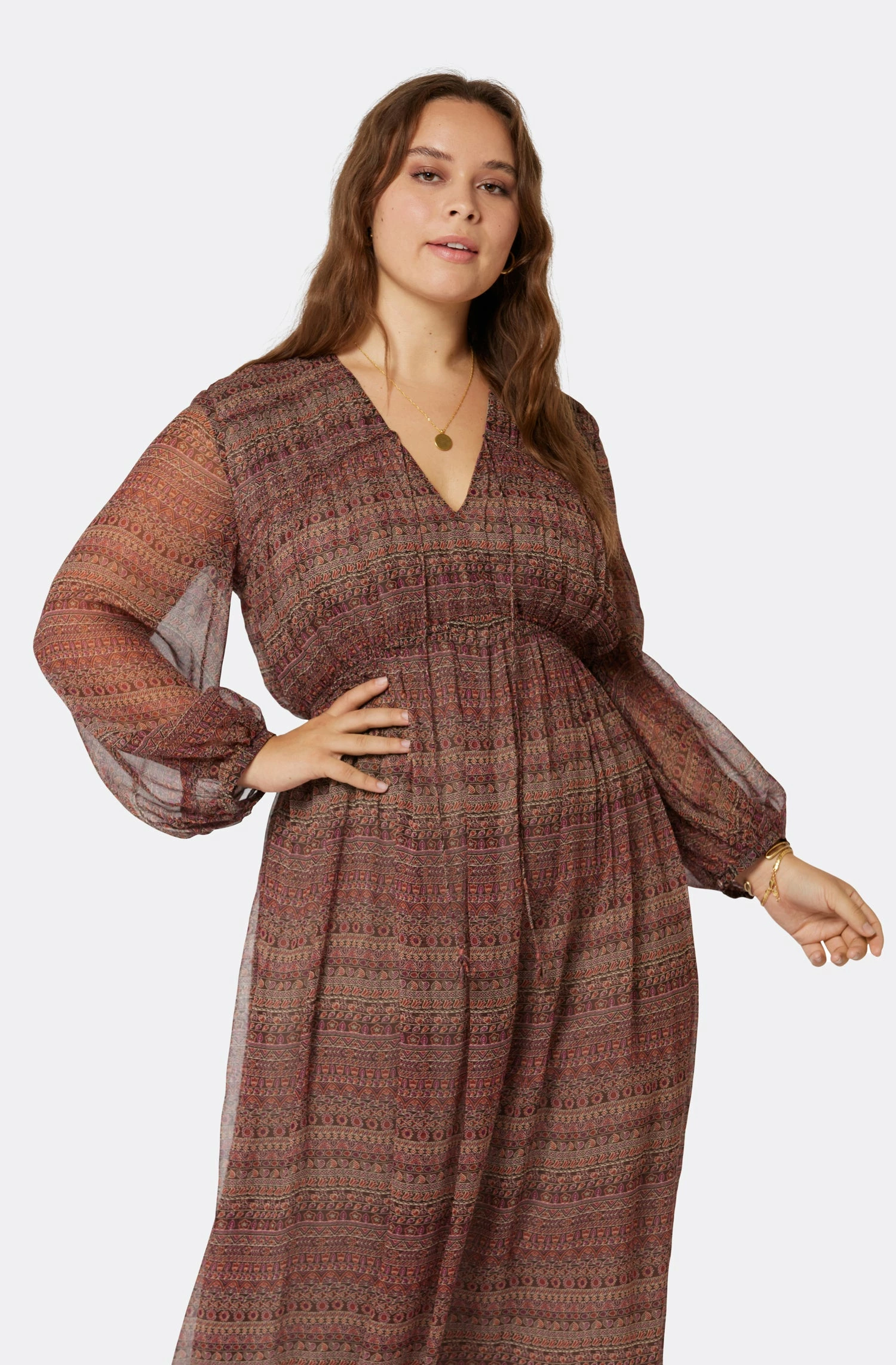 Silk georgette, drape, and a vintage-inspired pattern, The Alquina is your new go-to Boho dress of the season. Voluminous sleeves, flowing silhouette, and a cascading full skirt, this silk dress has endless layering possibilities.