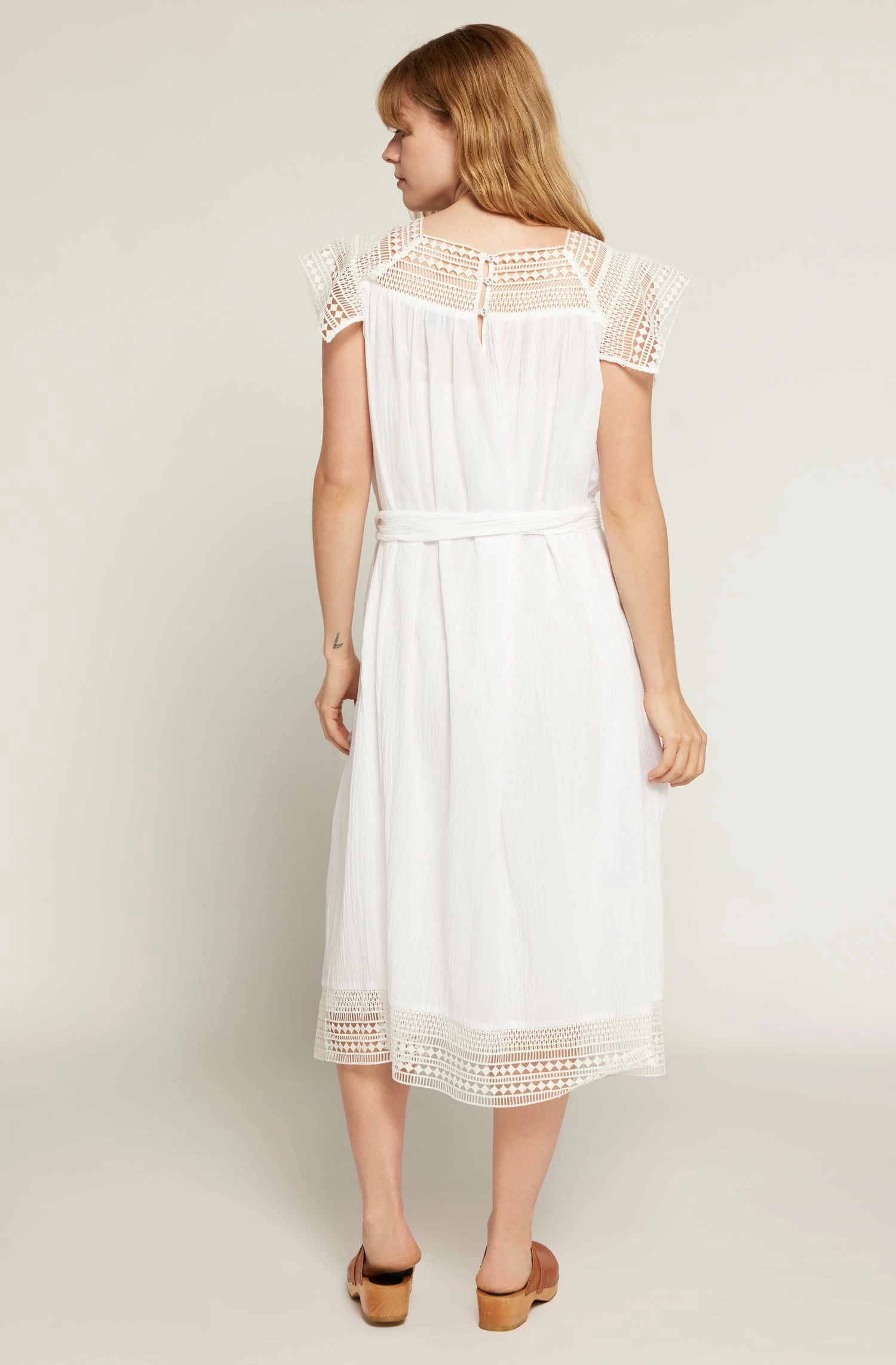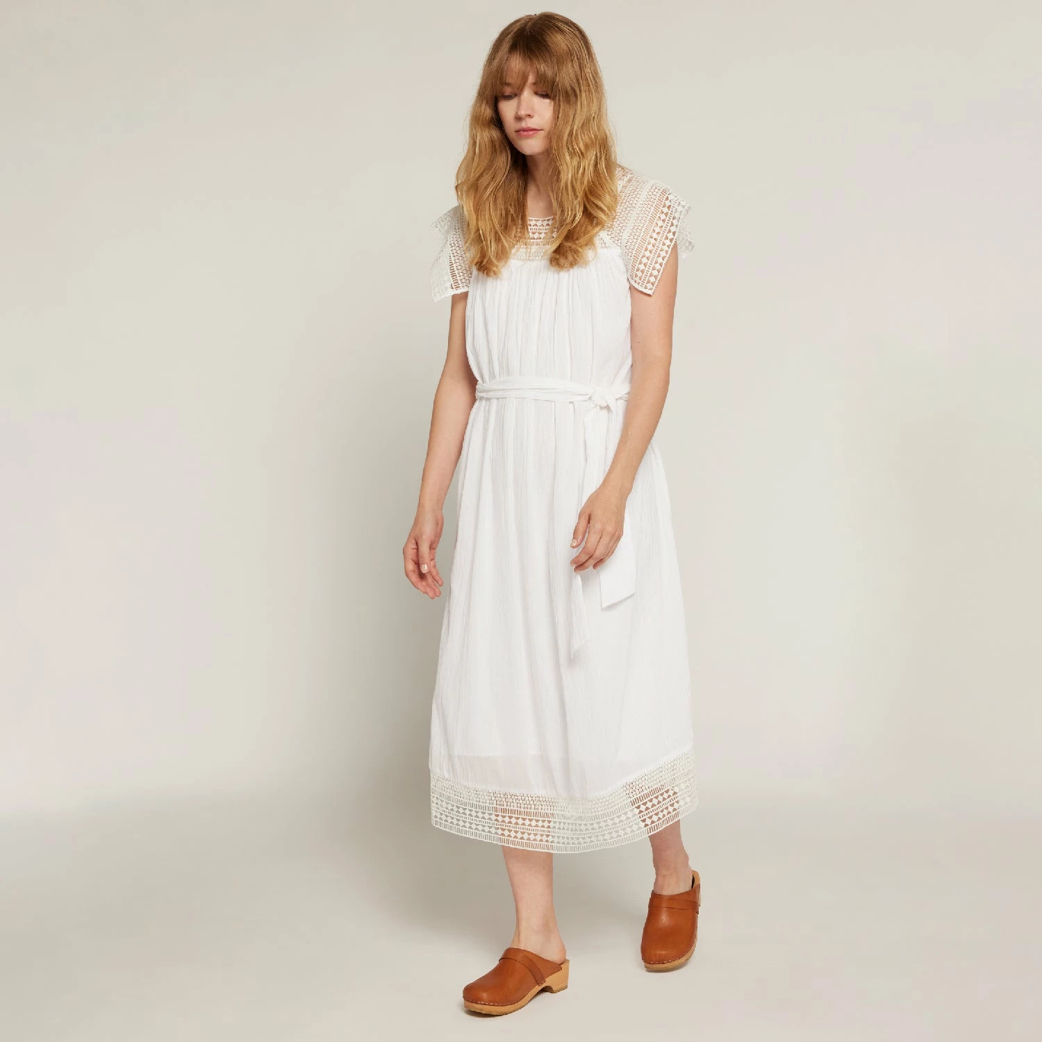The Aspen feels straight out of a romance novel with its whimsical silhouette and lightweight cut. This cotton design features hand-embroidered details in the bodice and the hemline as well as a tie belt for added shape.