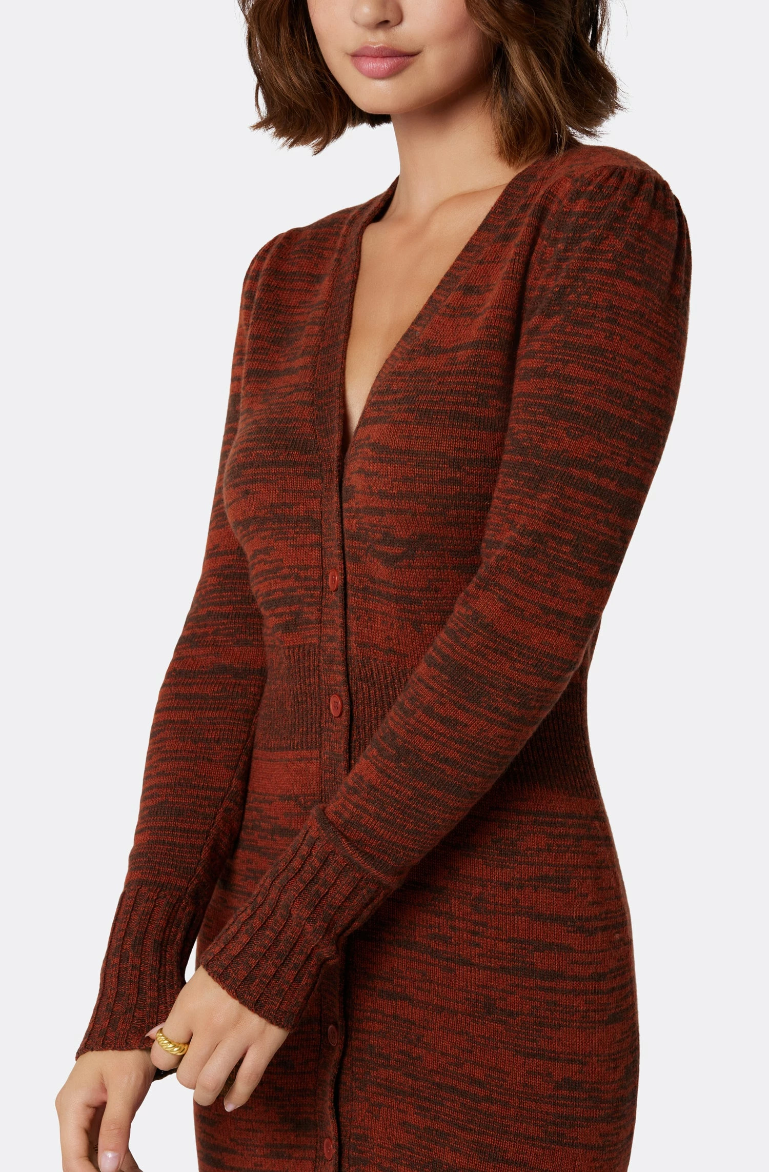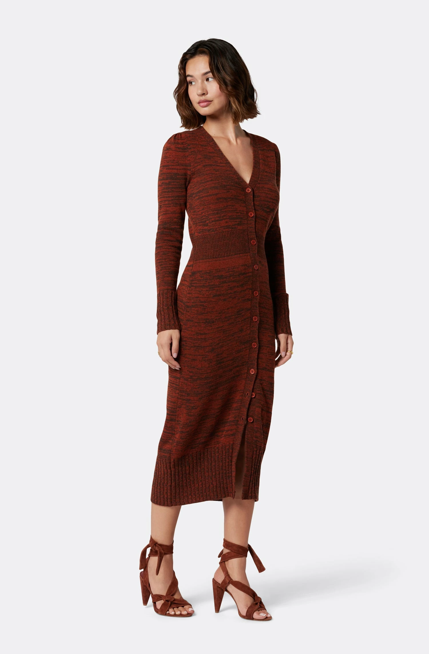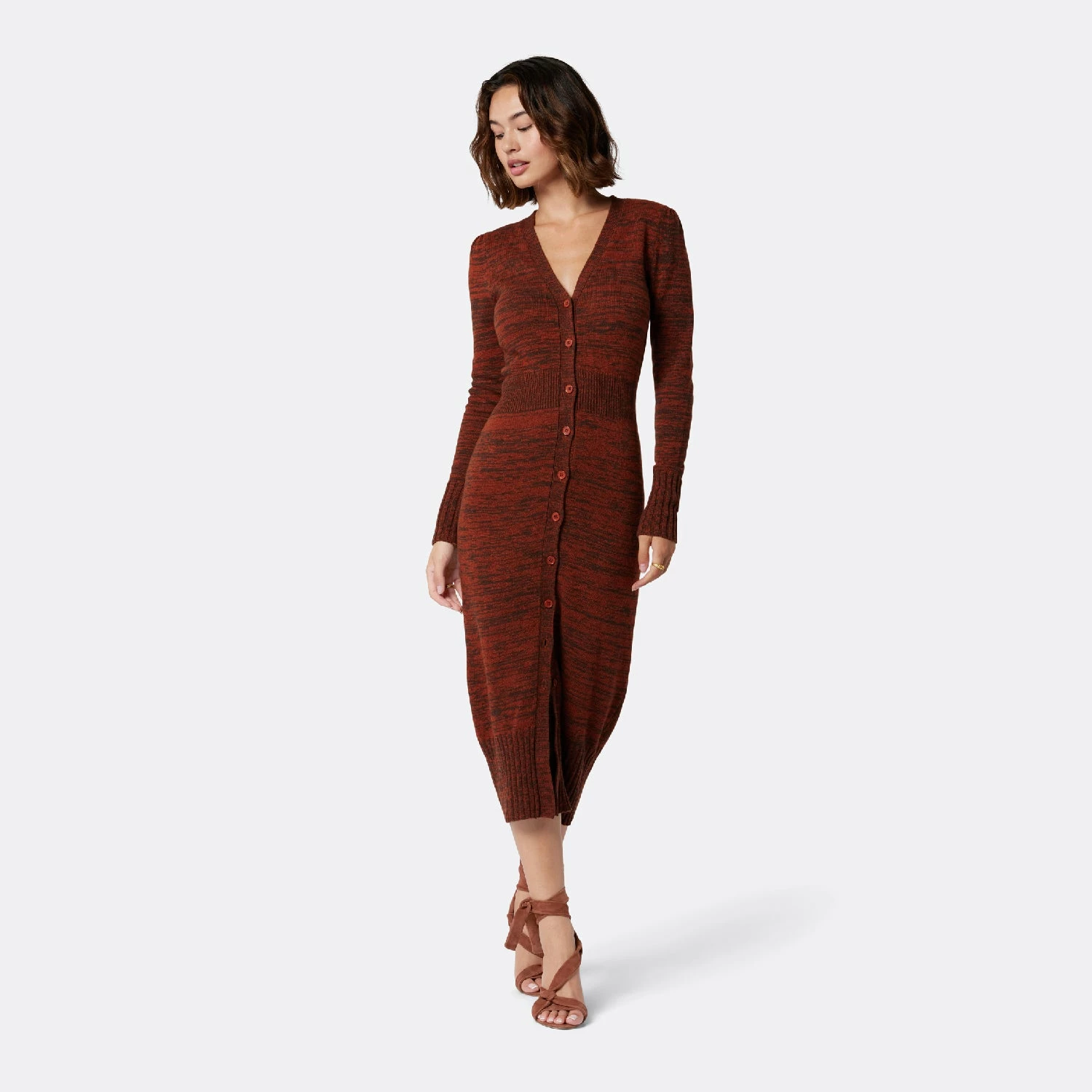 The Ebba hugs the body with ease, allowing your silhouette to shine. This sweater dress features a V-neckline and a button front closure.