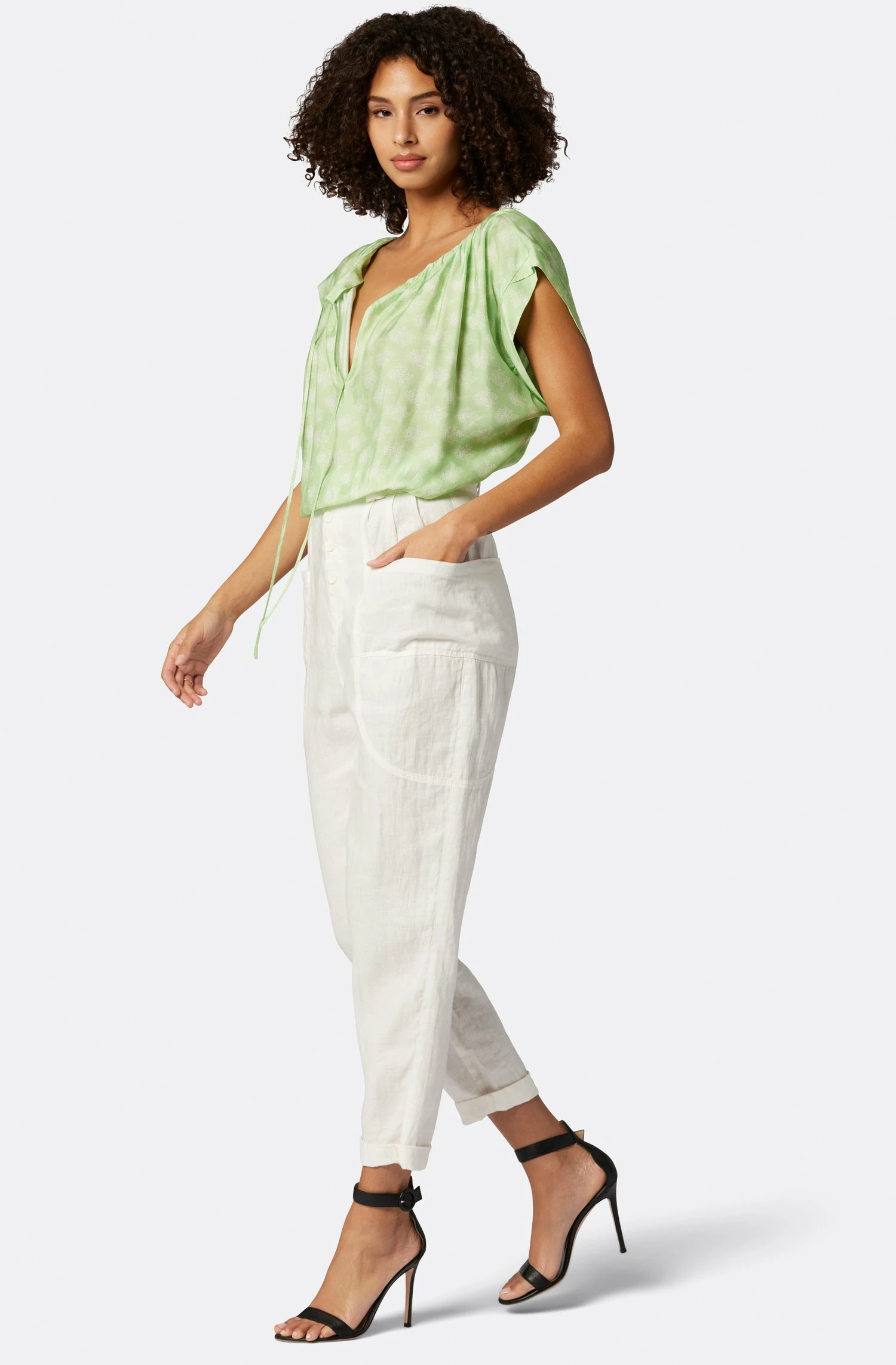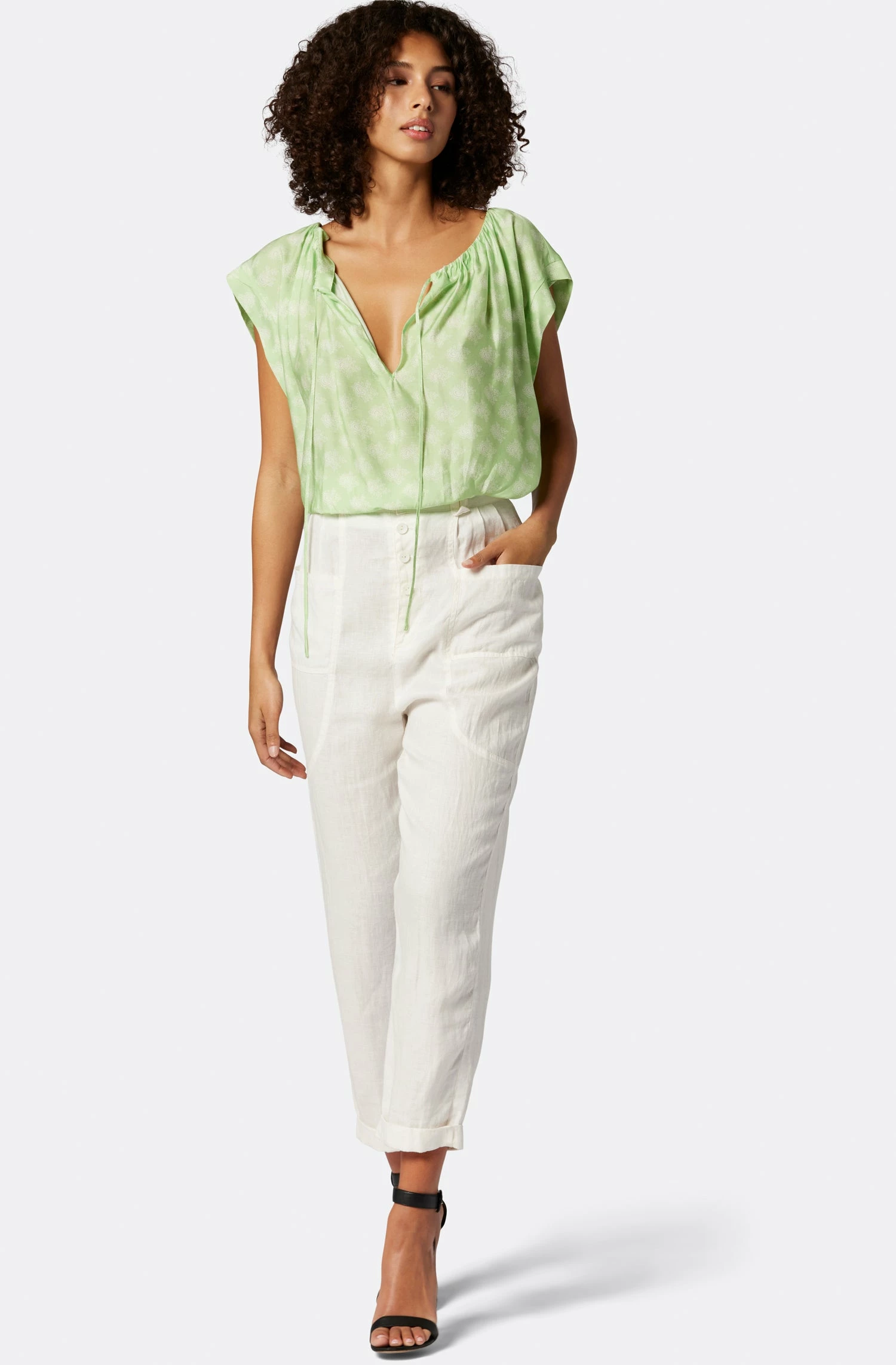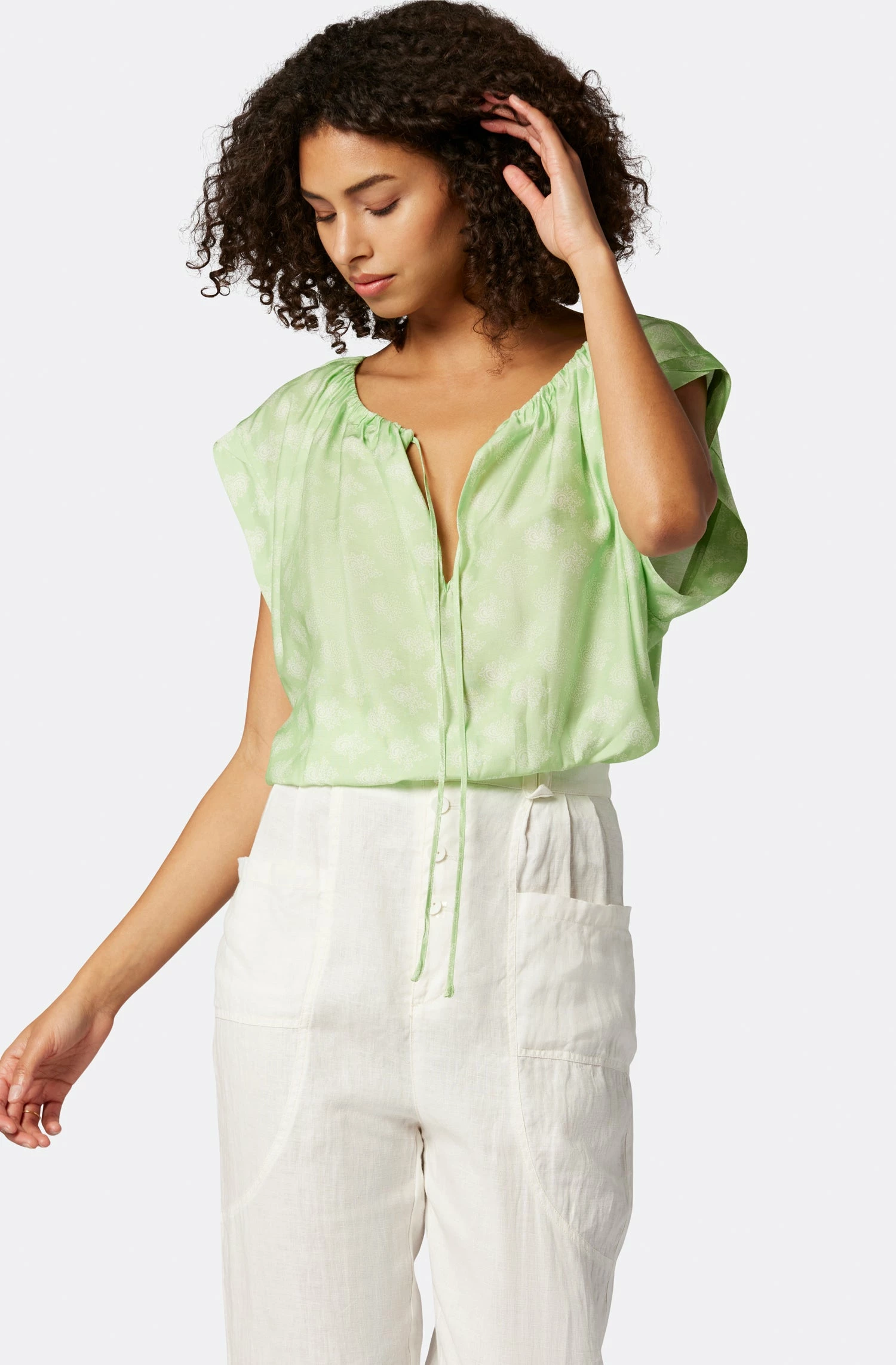 The Gwyneth evokes dreams of a spring fling with its drawstring neckline and relaxed silhouette that still flatters. This top looks great with linen pants or our Joie denim for a more casual look.