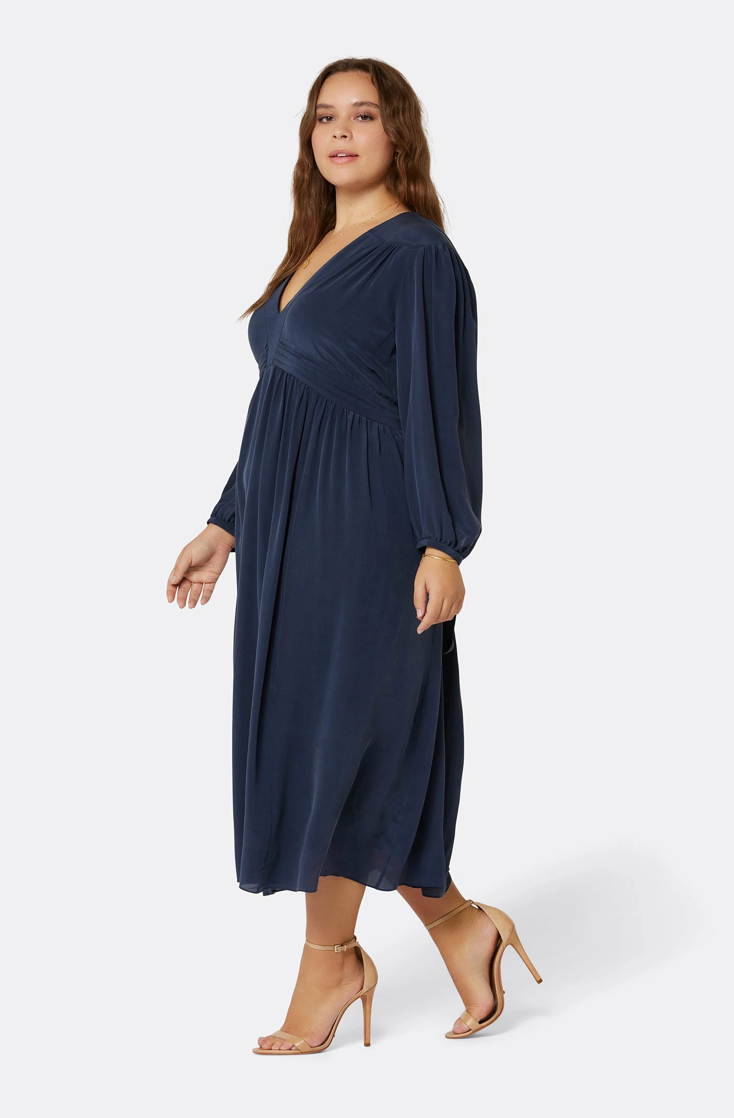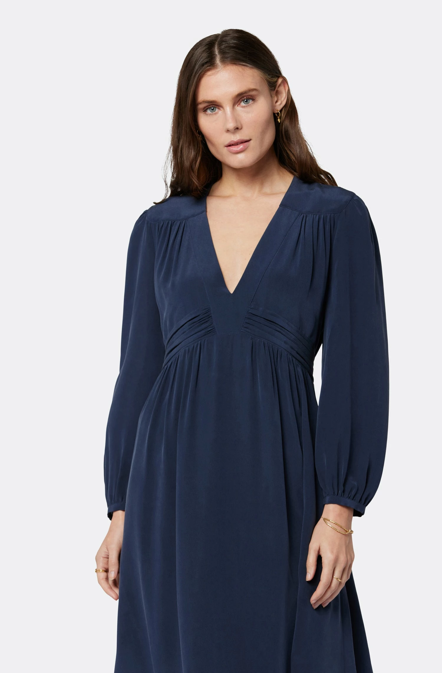 A lightweight silk dress with a flattering slim silhouette, V-neckline, and gentle gatherings all around the bodice. The Kaz is truly romantic and flows nicely as you move, making it the perfect transitional dress.