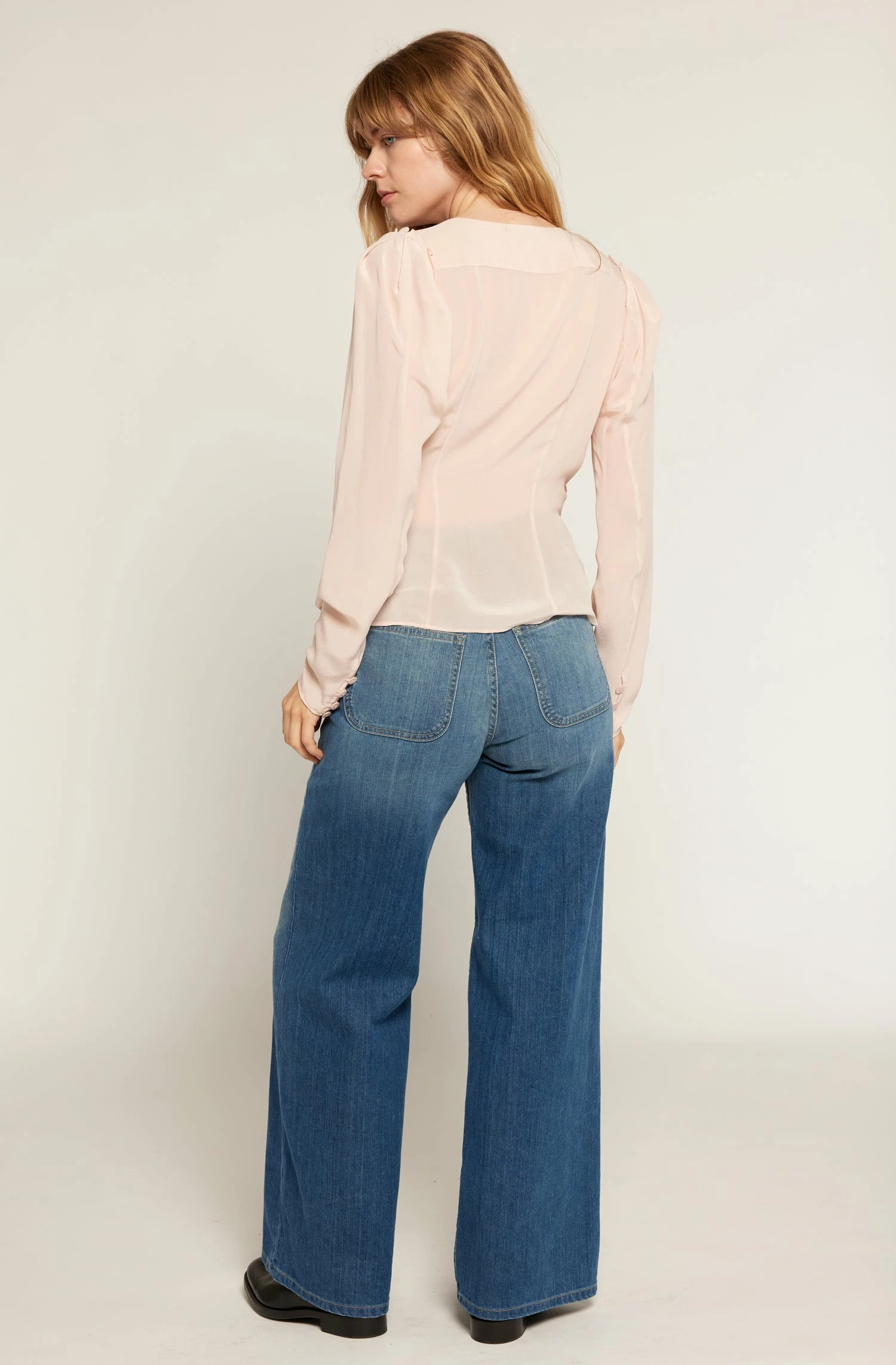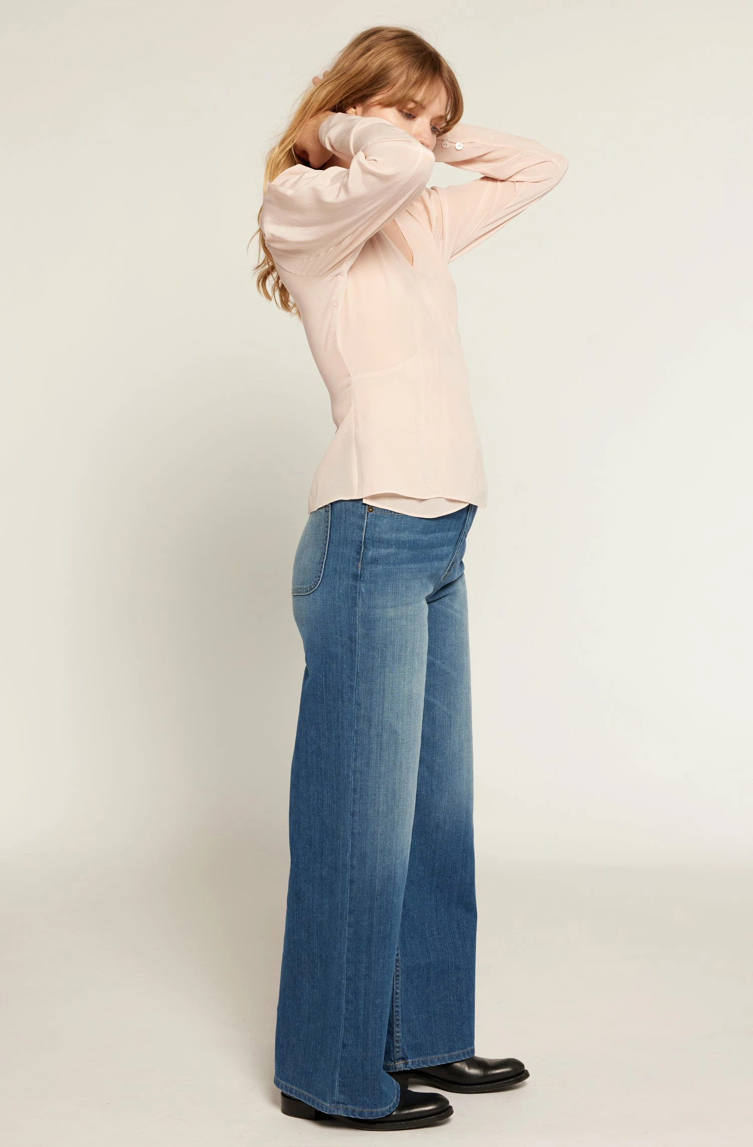 The Leigh is your quintessential wrap shirt of the season. Cut in luminous silk, this design can go from day to night with the right bottom and shoes.