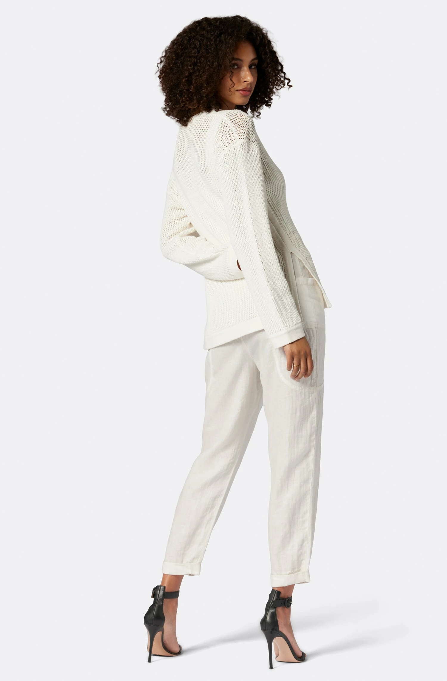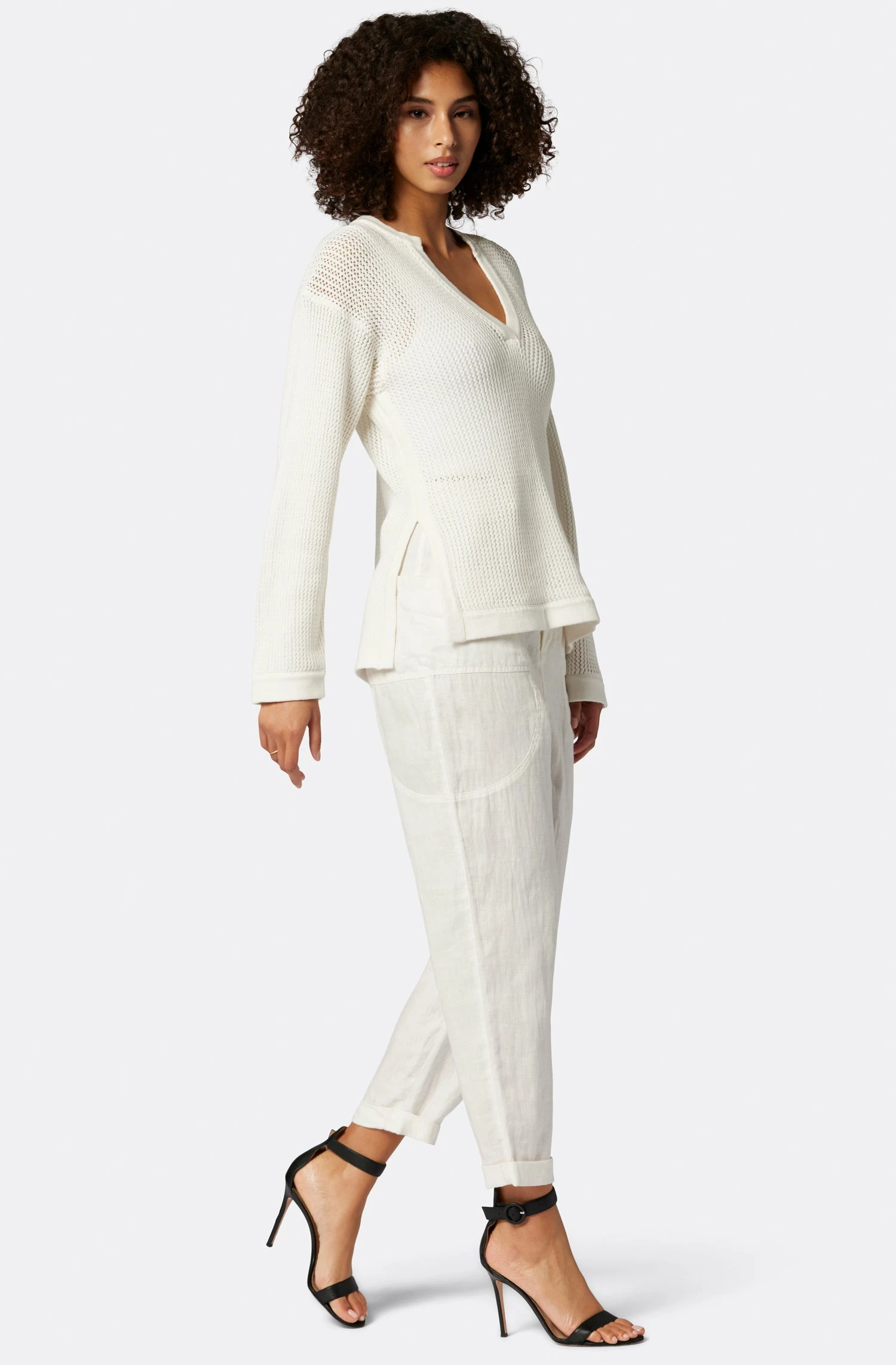 Fitted shape, side slits, and a V-neckline; this mesh crochet sweater is your new elevated essential.��