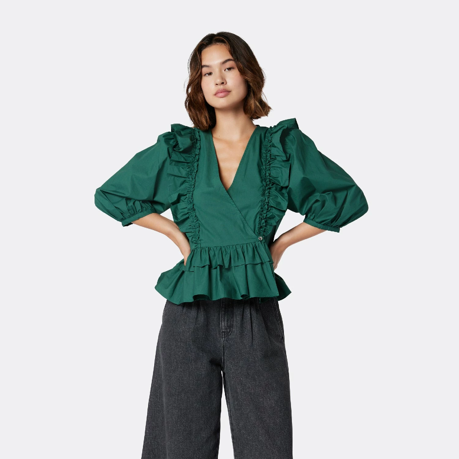 A modern and maximalist take on the peplum silhouette, this top features cascading ruffles at all angles, making it a standout wardrobe staple. With its structured shape and faux wrap waist, The Nellis is easy to wear while still flattering your figure.