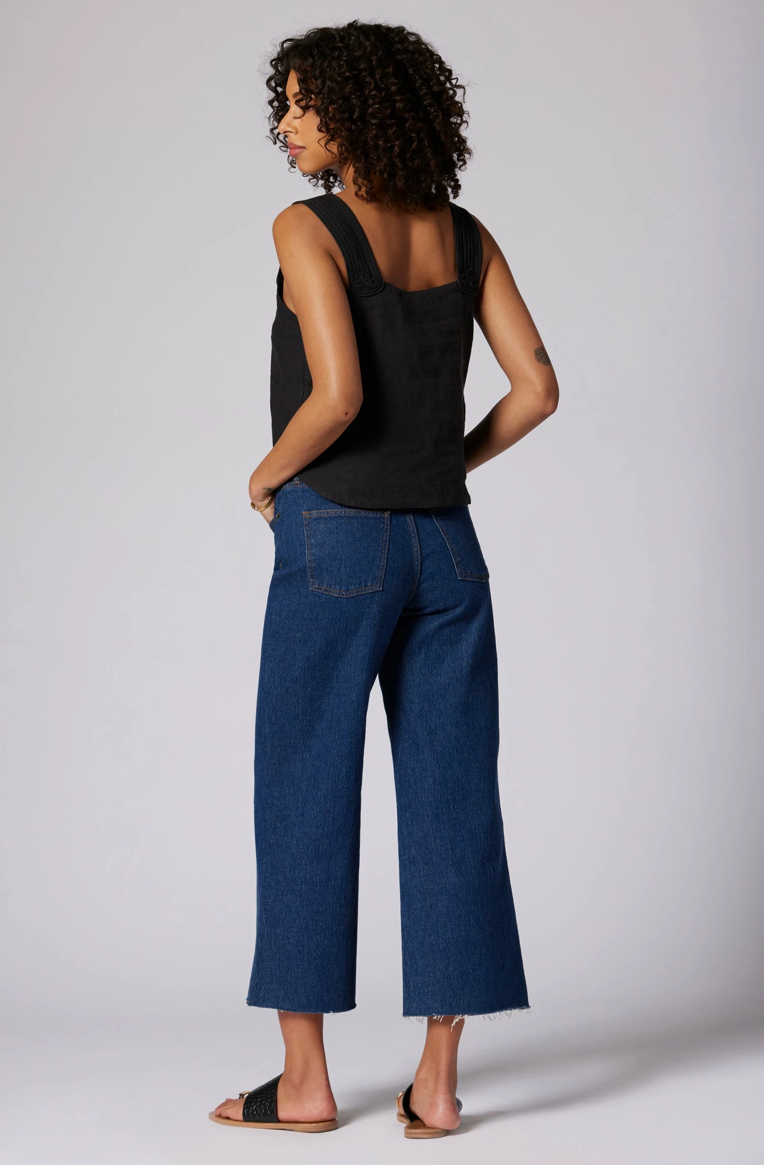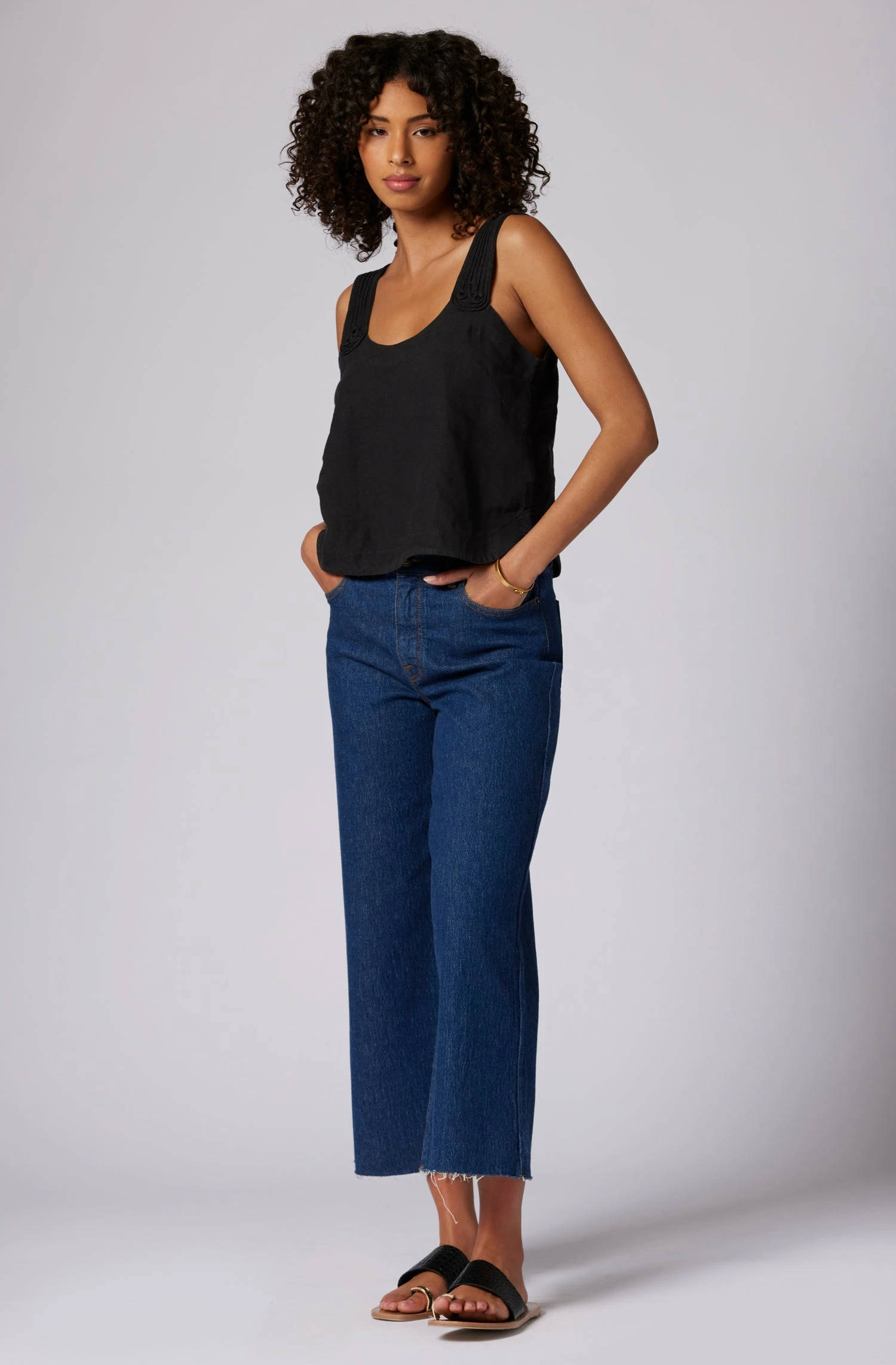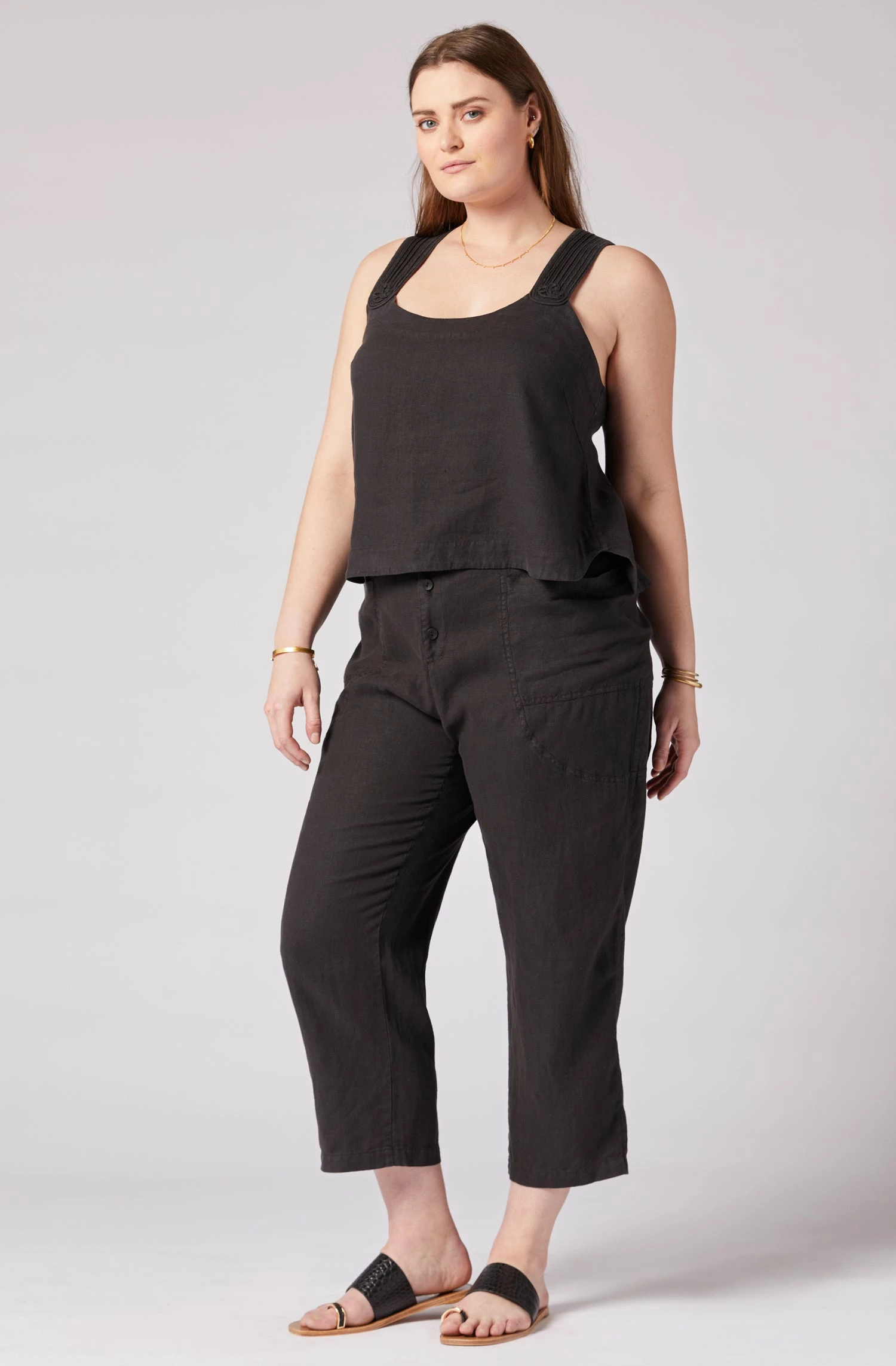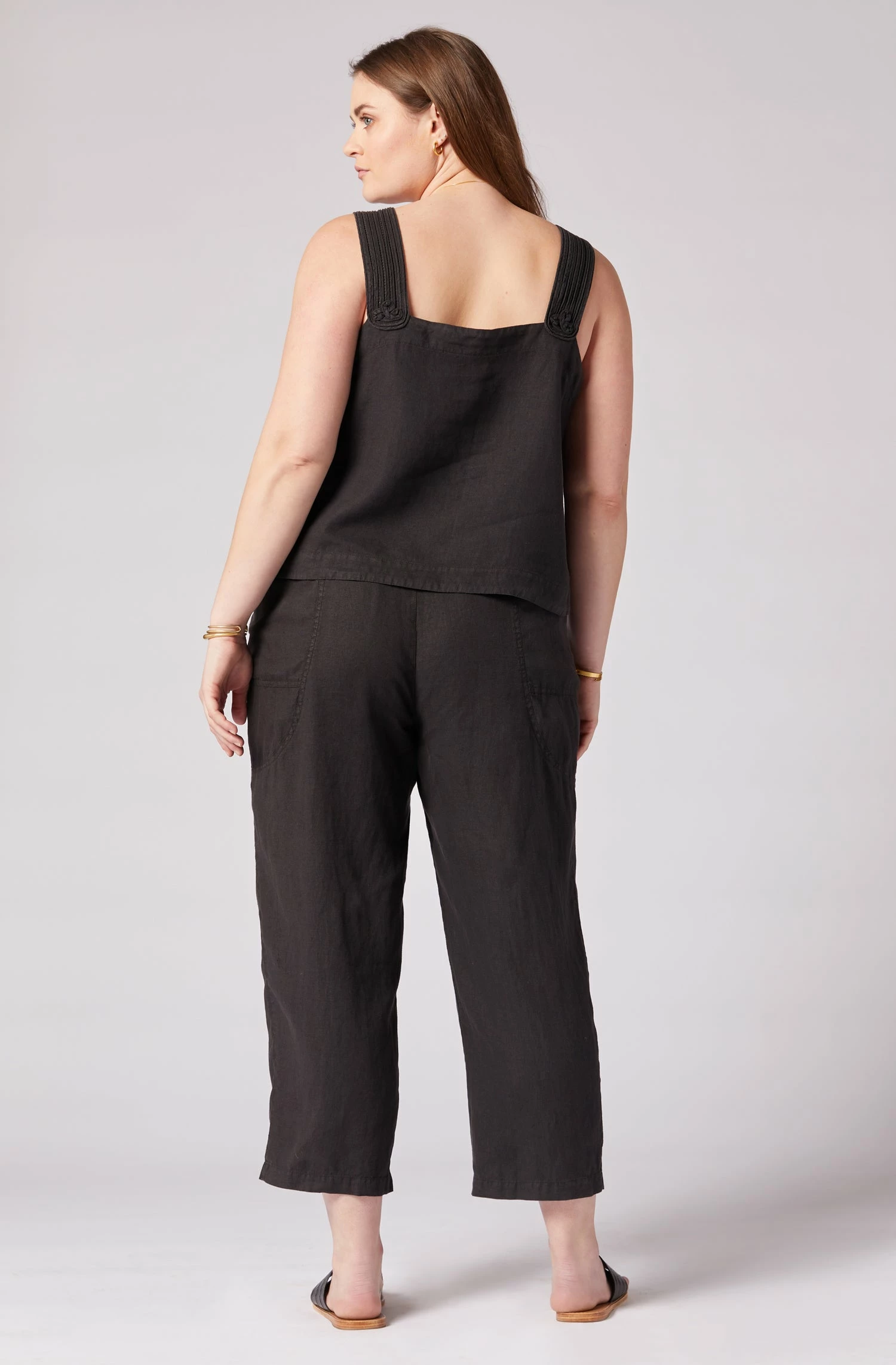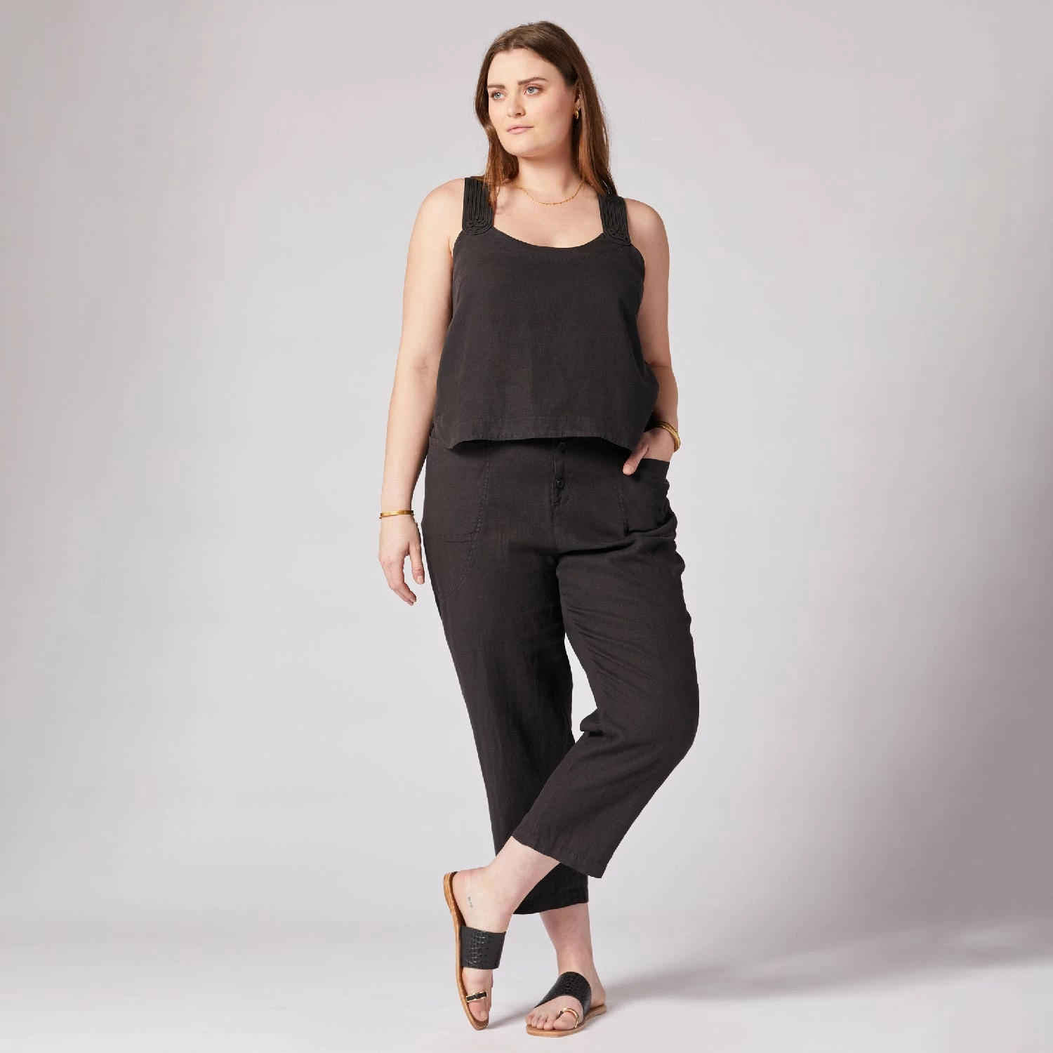 The Paisley is your quintessential spring linen top with wide straps and a round neck. Go for a matching linen look and wear it with The Gia.
