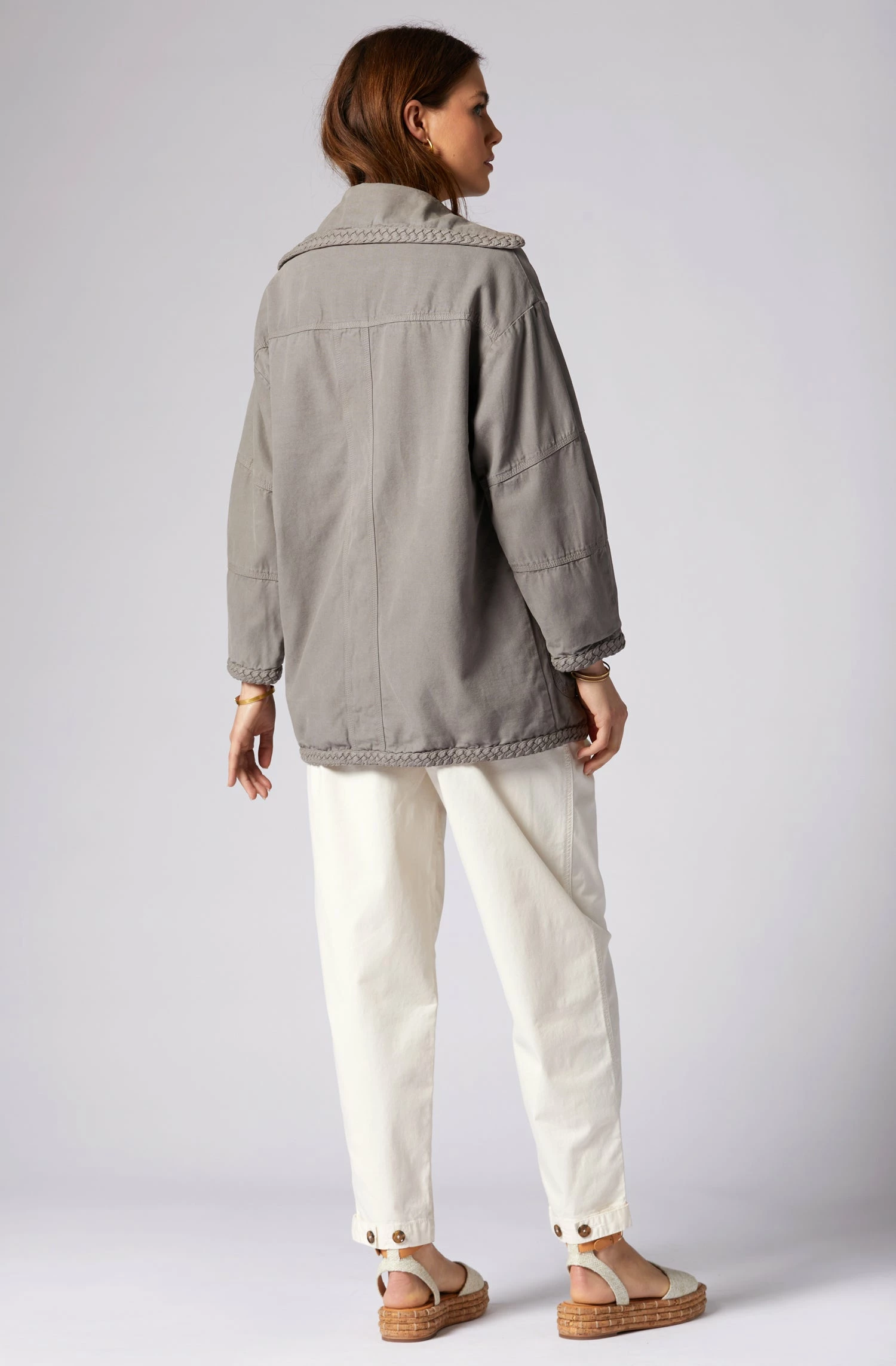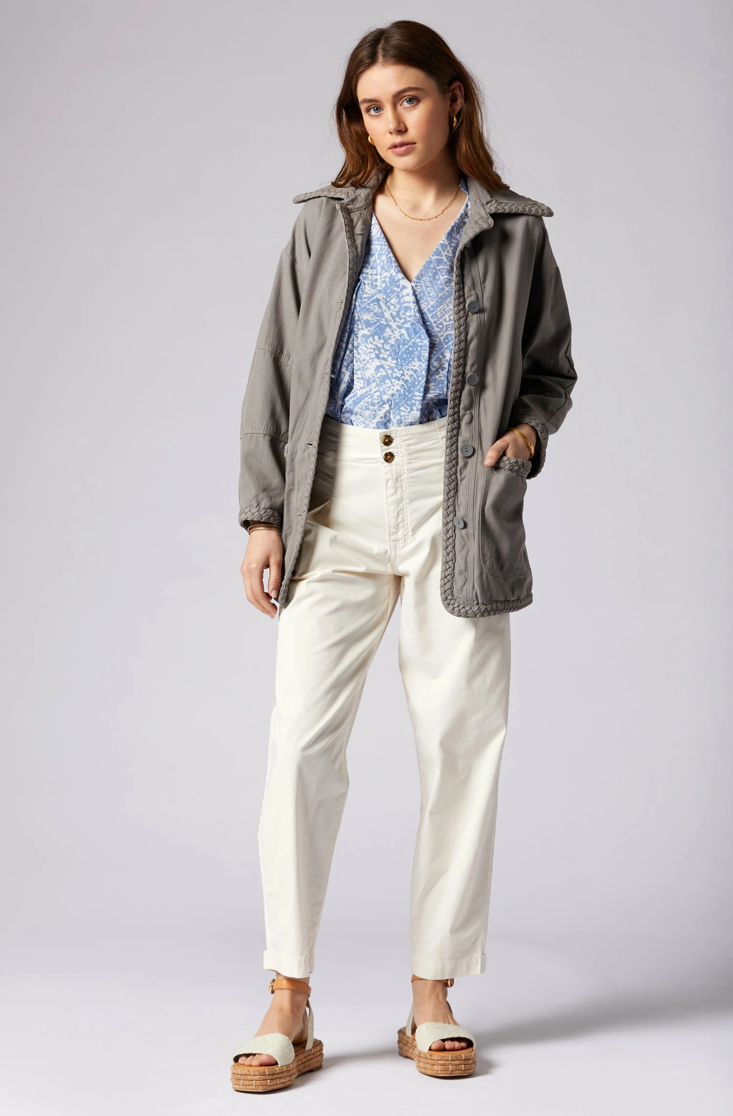 Upgrade your wardrobe with The Sivan – a versatile top that’s perfect for layering or wearing on its own. Made from luxurious Panama twill, this top features an oversized collar and relaxed fit with braided details that elevate its unique design.