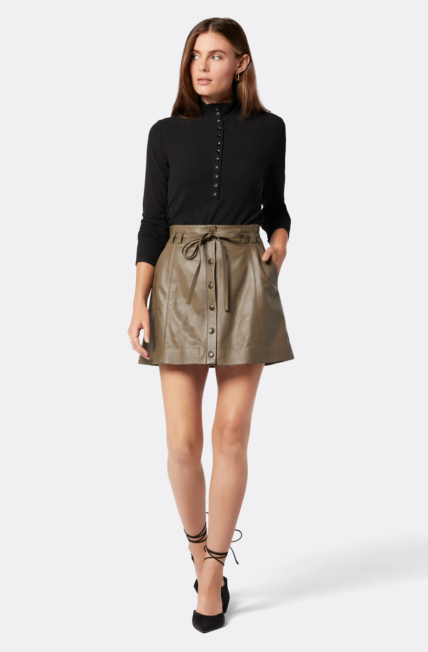 The fall mini skirt that you must have is here. The Tolain is cut in buttery leather and features convenient side pockets, a string tie belt, and a front button closure. Wear it with tights, boots, and an oversized sweater for a little retro look.